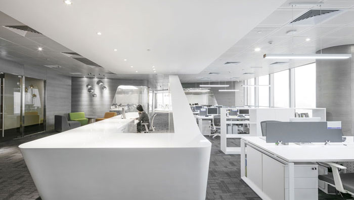 ? 前臺的設(shè)計:前臺給人的感覺好像從天而降一般,這也是因為整個空間呈開放式分布,設(shè)計師為了避免整個空間一覽無余,故此選用造型新穎、別致的前臺,這樣的前臺除了承擔(dān)起接待的任務(wù),同時也要承擔(dān)阻隔的作用,在山尖處設(shè)計師將logo安置在此處,為企業(yè)的發(fā)展指明了方向。