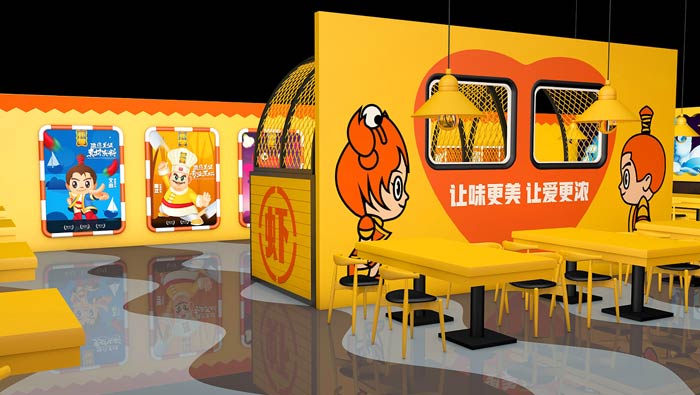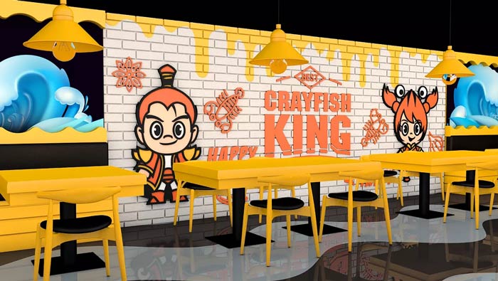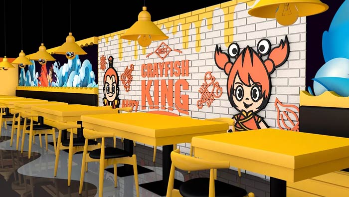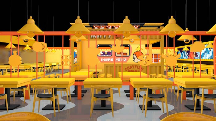 小龍蝦主題餐廳平面設計:所謂的平面設計,就是人平時看到的樣子,任何事物第一眼都十分重要,黃色的空間讓人難以忘懷,這就是設計師要做的設計營銷。