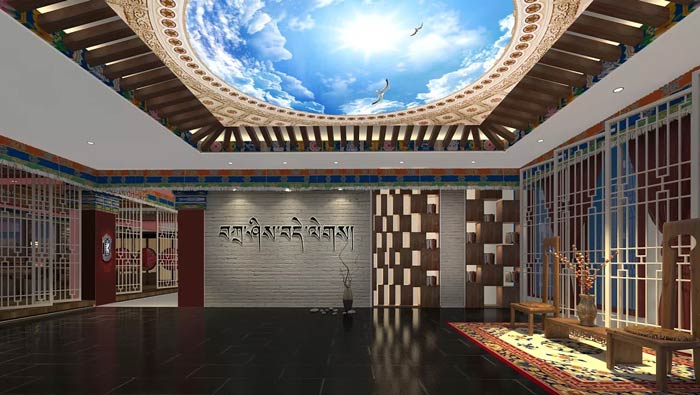藏式主題餐廳進門區設計:設計師首先表達的就是藏族文化【文字】,其次表達的就是西藏的自然風景,雄鷹在藍天自由的翱翔,以此展示豐富、燦爛的藏族文化。