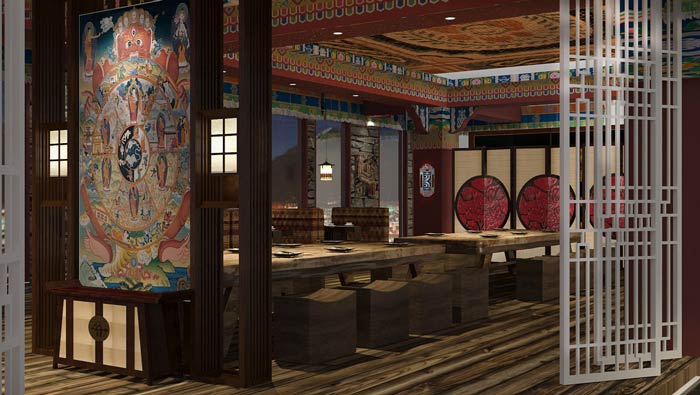藏式主題餐廳就餐區設計:在設計中設計師對藏式風格進行了調整,設計師希望將藏式風格做的更加精簡,以此融入整個發展之中,這里表現的是藏族文化與現在文化的融合。