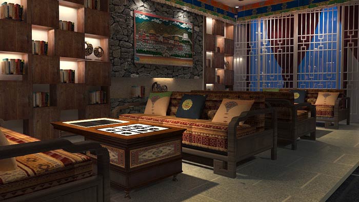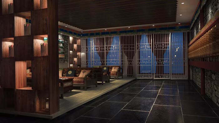 藏式主題餐廳等待區設計:當餐廳爆滿的時候,客戶將在這里等待,客戶可以在這里看看書、聊聊天,以此抵消等待的煩惱,這也是設計師希望看到的。